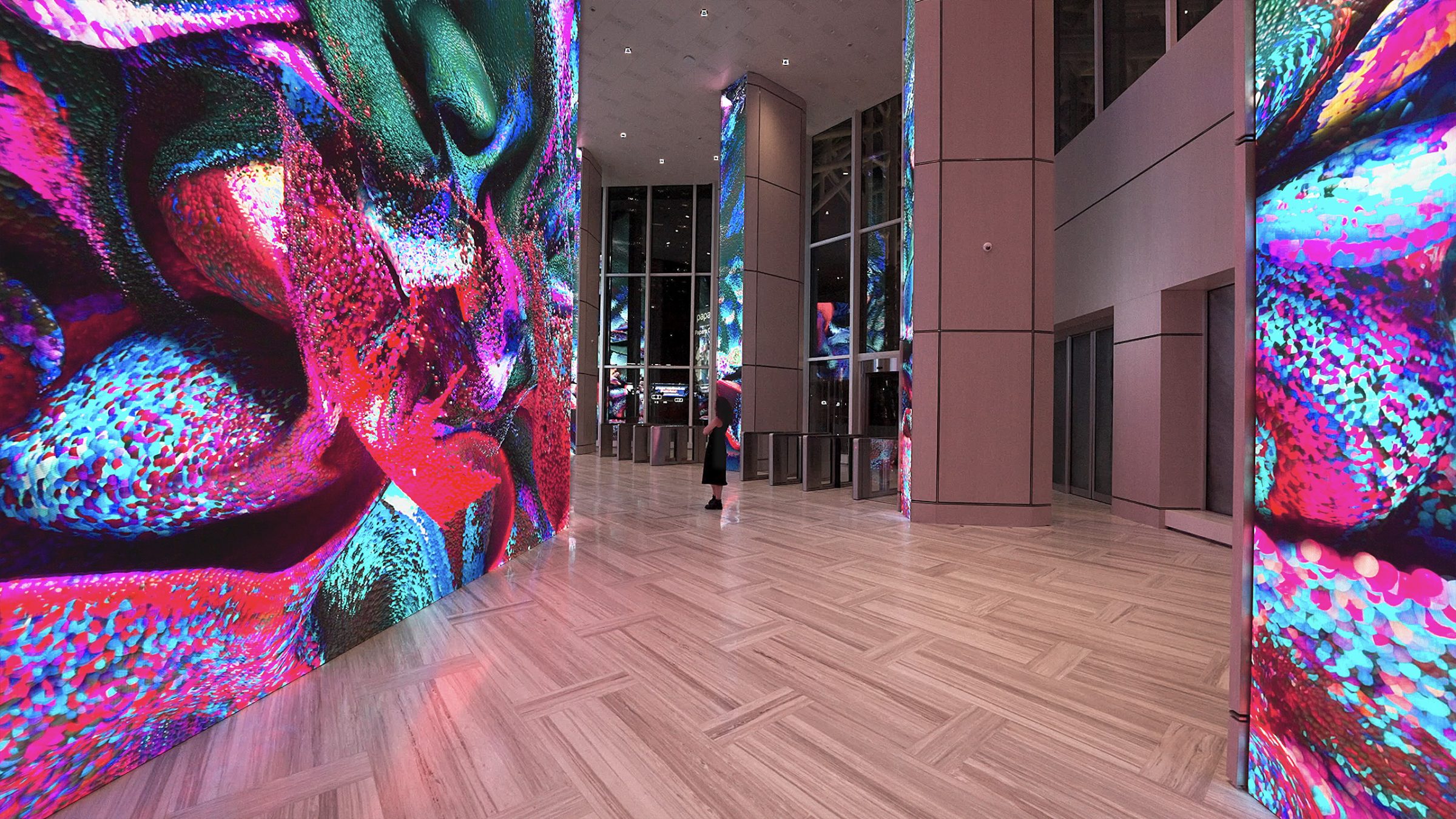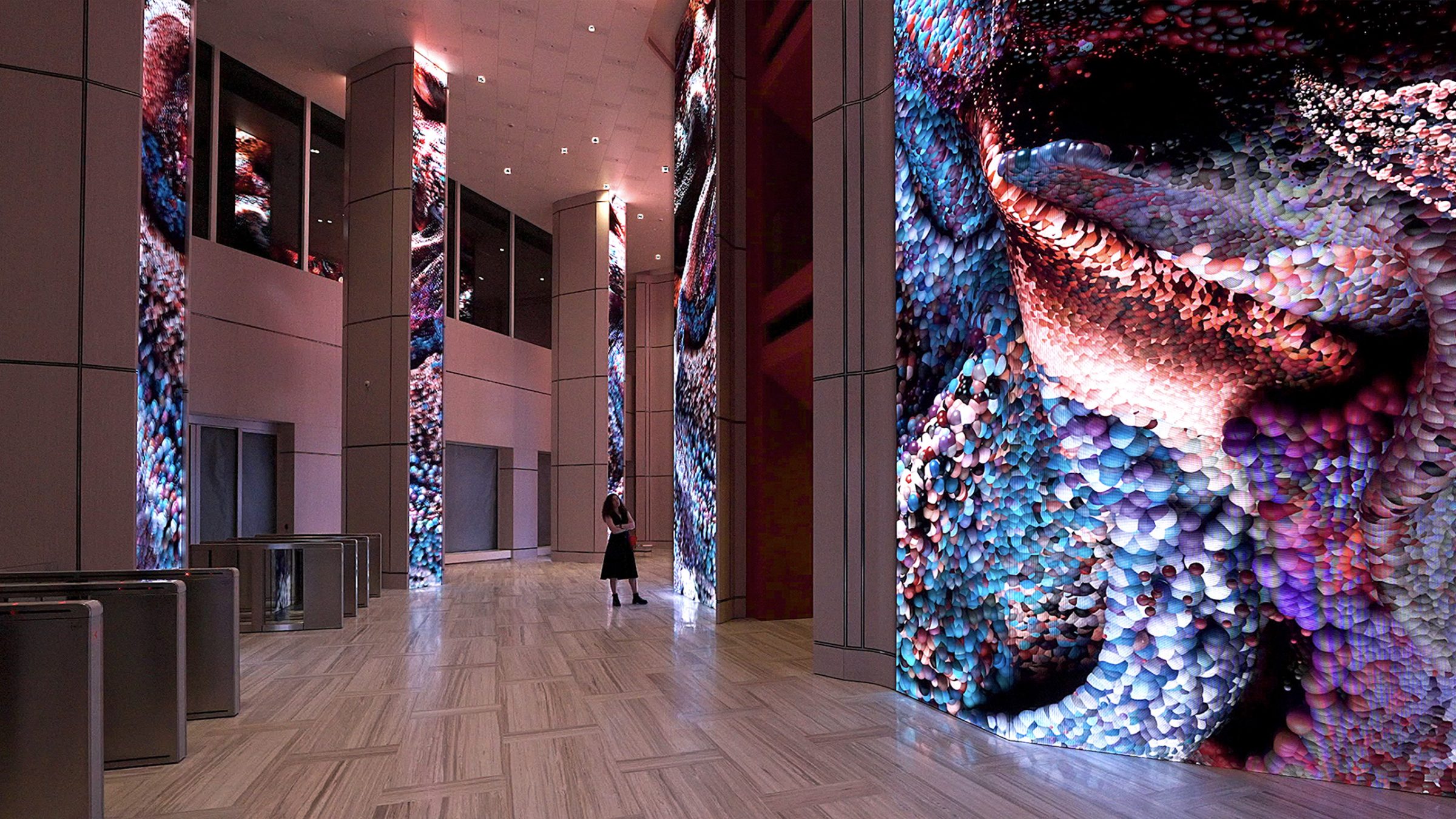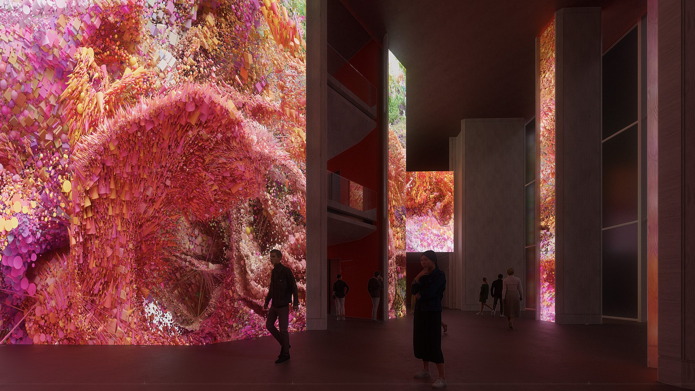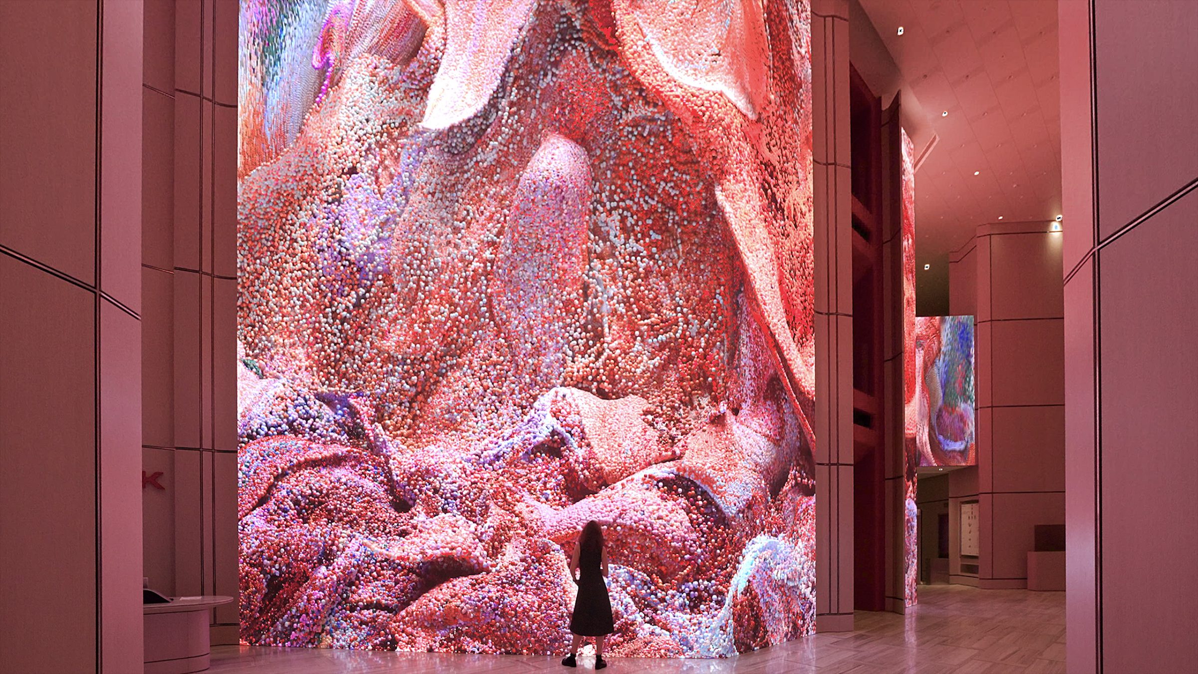 Refik Anadol’s groundbreaking approach to AI-based immersive data narratives takes the audience on a mesmerizing journey of light and color in this unique artwork designed specifically for AKBANK’s Headquarters. DATAFALL: AKBANK features a dataset that combines memories of nature and history, including weather data from Istanbul and coral ecosystems. This fusion reflects and represent the natural fabric of Istanbul, surrounded by waters, and the complex rhythms of the urban center. As a dynamic suite of images, the final artwork encourages the audience to reflect on the emerging relationships between aesthetics, nature, and data science. Anadol and his team harnesses a comprehensive dataset and train a unique machine learning model with subsets of the collected data. The artwork brings different aspects of AKBANK’s archives and nature data to life, creating a musing yet provocative experience through a machine’s capacity for visualizing data based on the traces of our collective memories. The fluidity of the visual patterns performs a digital synthesis of this data and represent the many interlocking layers of humanity, nature, aesthetics, and technology in the age of data and machine intelligence.