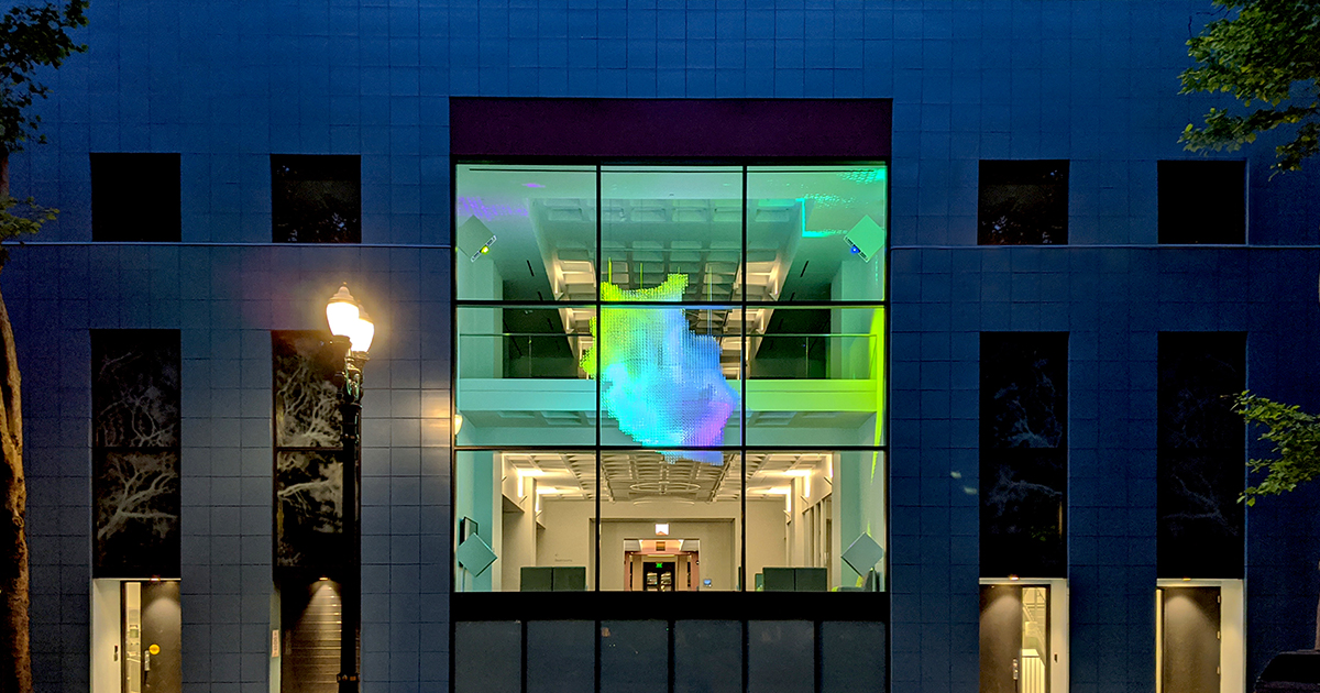 Custom software, quantum computing data, generative algorithm with artificial intelligence (AI), real time digital animation on LED screen, 4 channel sound